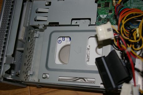 HDDに接続されているIDEケーブルと電源ケーブルを取り外さないと、取り外しづらいので、先に取り外しておきます。IDEケーブルは下の写真のコネクタ部分についている黒いタブのようなものをつかみHDDと水平方向(写真の右方向)に横に引っ張って取り外します。電源の白のコネクタはコネクタ部分をもってはずします。(私はケーブル部分をひっぱりましたが)